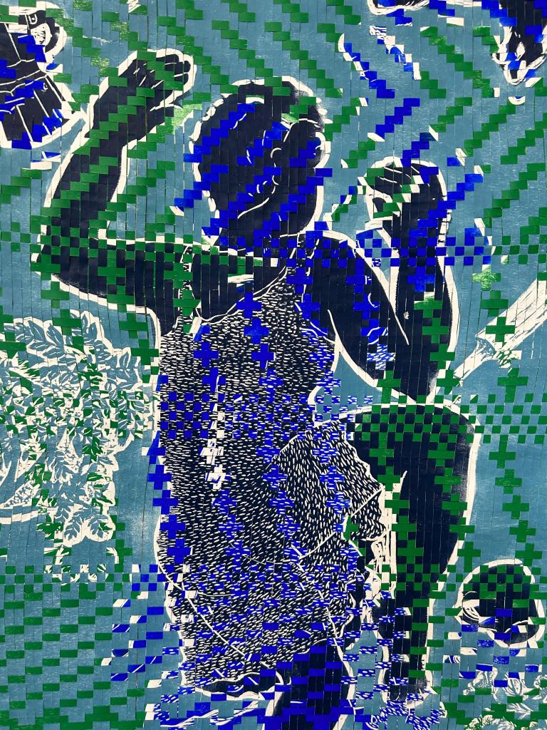 We were introduced to two of the fellows, co-curator Vrushali Mehta, selected from the Indian cohort who has been working alongside EP, and Sofia Cotrona. As we were guided through the exhibition with notes of curatorial decisions which enables a conversation between artworks in the space – it was hard to ignore Anupa Gardner’s suspended works, ‘In Between’. They are colourful woodcut prints which were handwoven to imitate mats. The mats are reminiscent of ‘paai’, a South Indian grass mat that would be found on the floors of homes in India, Gardner’s included. ‘In Between’ gives warmth to the surrounding artworks, situated in the centre of the space. Perhaps an invitation to get comfortable and spend time exploring the patterns and colours within the piece whilst being drawn to correlating textures, colours, and patterns on the outer walls of the space. As we delved deeper into the exhibition, we could see the depth and passion behind the voices of both the artworks and the curatorial fellows. There is a lot to learn from the boundaries between communities, home life, the colourful depiction of India as well as histories of occupation and colonialism.