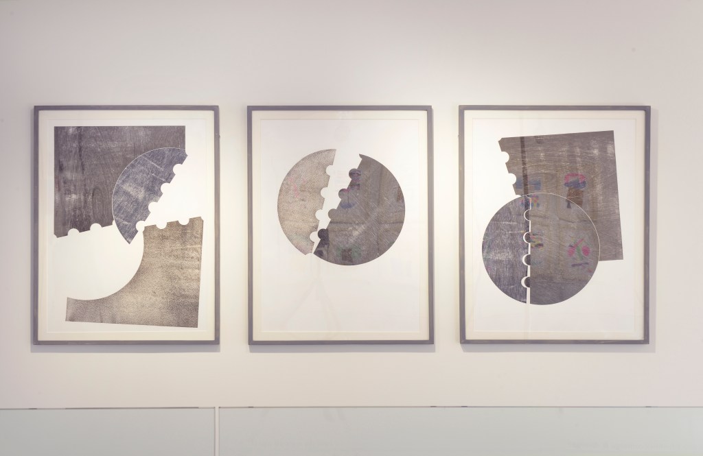 It is described that the works are to represent mechanical shapes, but I enjoy the transferable properties these ambiguous shapes deliver. Cotrona was extremely informative about Barclay’s sourcing of textures from the Edinburgh Printmaker’s own impressive print studio.