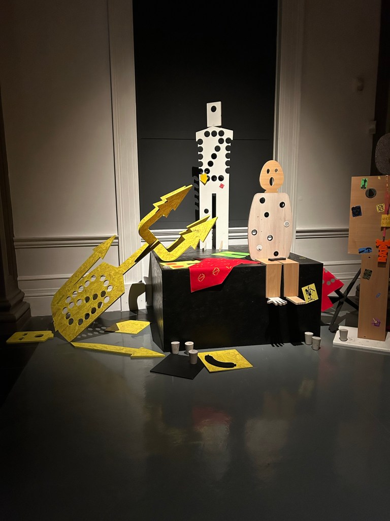 Beyond the nook I was met with a peripheral view of the space: straight ahead were wooden figures fashioned with downward arrows and looking to my left I could see the centre-stage catwalk showcasing the model trio. On stage, at the back of the line are two dark monochromatic forms dawned in south facing arrows overshadowed by the imposing tape-wrapped prism. The spotlight shone brightly upon the geometric giant casting wings behind it, alluding to its status as a heavenly idol. Its ethereal nature raptured by the consumers; its shelf-life ephemeral.