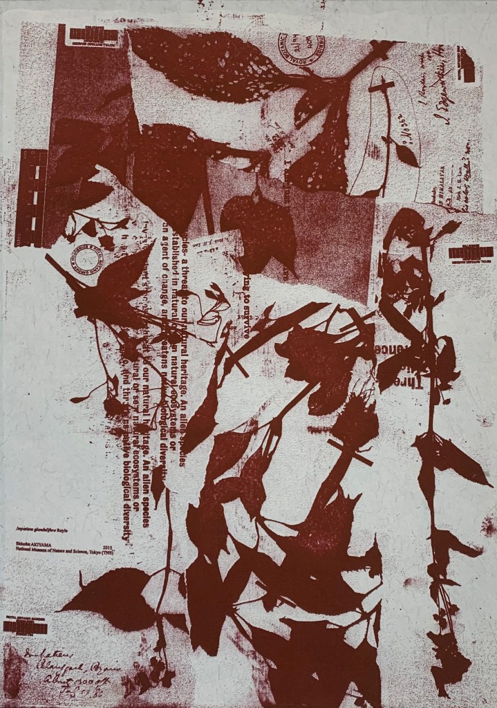 “In Nishi Chodimella’s prints, the Himalayan Balsam plant, considered an invasive species, is used to explore capitalise attitudes towards ecosystems.” Caption from Edinburgh Print Maker’s website