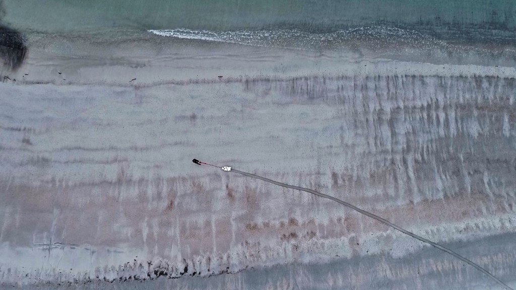 Shaw was able to find both the tail and the head, though, unlike the body of blubber, the head was picked clean of its meaty membrane leaving an immaculate skull. An image of the skull can be viewed at the Sounding Line exhibition, neighboured by photographs of “Sand Etchings”, as Shaw likes to call them. These wide and extremely shallow channels created by small eddies depict a marbled texture consisting of black volcanic sand mixed with white sand, highlighting an abstract beauty and adding to the natural artistry of the land.