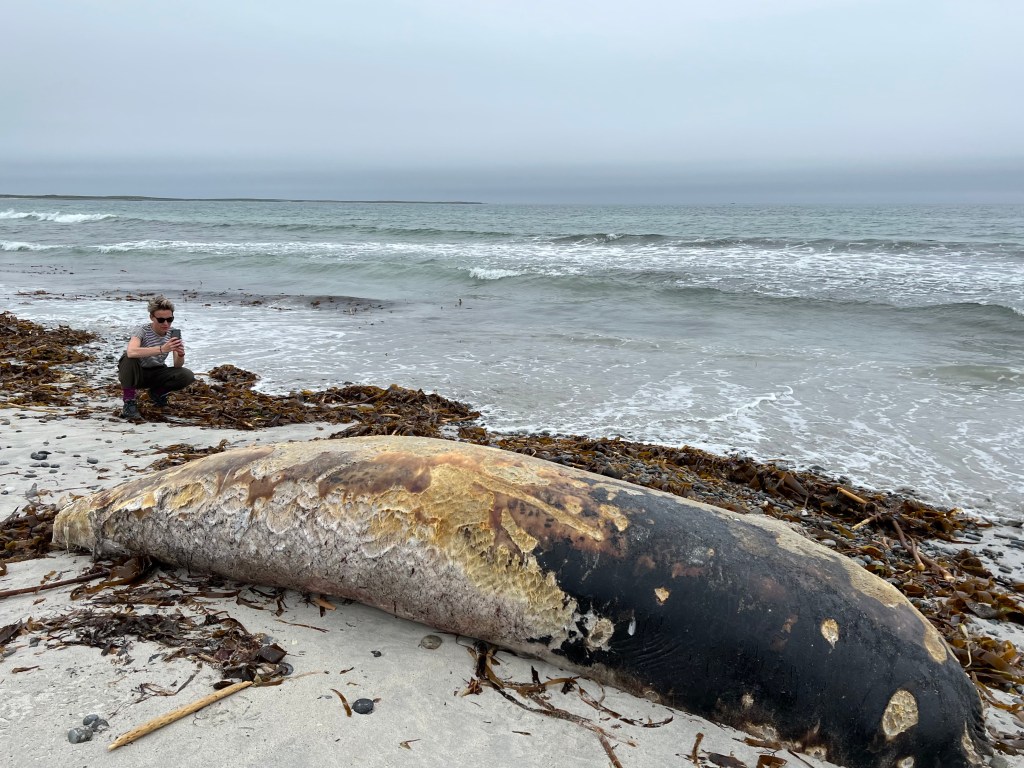 From research to travelling, An Doirlinn beach, South Uist, was a recommended site to explore and it was on this shoreline that Shaw (un)fortunately discovered a rotting Minke whale carcass whose smell, as she described, was so pungent that it has burnt itself into her sensory’s memory. An interesting feature (or lack of) regarding this beached creature was that it was both without a head and tail fin enhancing the “Otherness” of this creature to Shaw. It does not belong on land, yet here it is; it is a large and impressive form, yet here it is; it’s final resting place, not the grave nature intended for it. It is like it was given the option to choose heads or tail(s) but was denied both.