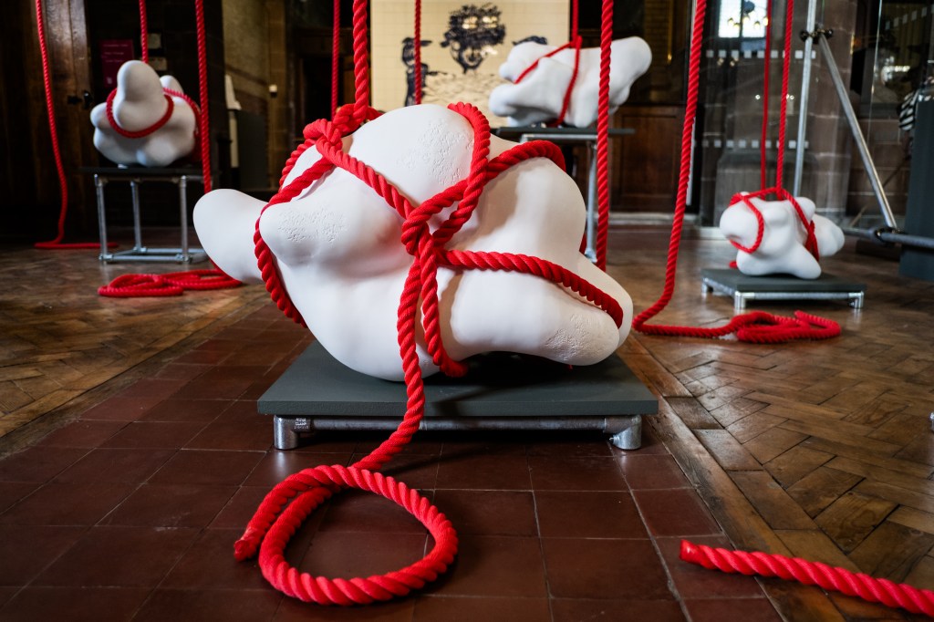 As a way to neatly tie her clay sculptures in a bow, Shaw added the sea-depth measuring rope known as a sounding line, hence the title. These vibrant red marine ropes contrast against the startling white sculptures, like a blood vessel feeding its organ. The sounding line rope not only brings life with colour but also brings life through sensory engagement (thankfully not through the nose-burning kind). Collaborating with artist Theodore Koterwas who was able to resonate the vibrations pulled from a 24 hour recording of sonar and ships condensed into 24 minutes, the public are able to experience and immerse themselves encouraging reflection on this matter.