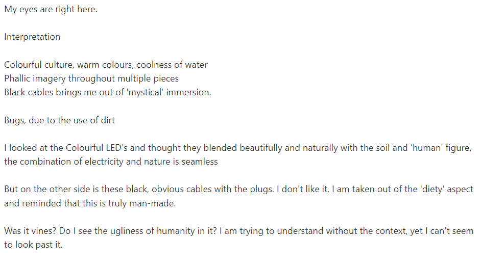 The prompts followed a process that encouraged independent inspection of the installation to form an opinion or emotional response, later, to be used for a group discussion. The collaborating prompt was inspired by the environment’s dialect as the individual sculptures displayed multiple dialogues between one another. Having the artwriters relay their short hand responses to their chosen work provided a window into one another’s reflections, an invigorating portion of the event as all participants revealed unique single-word extractions.