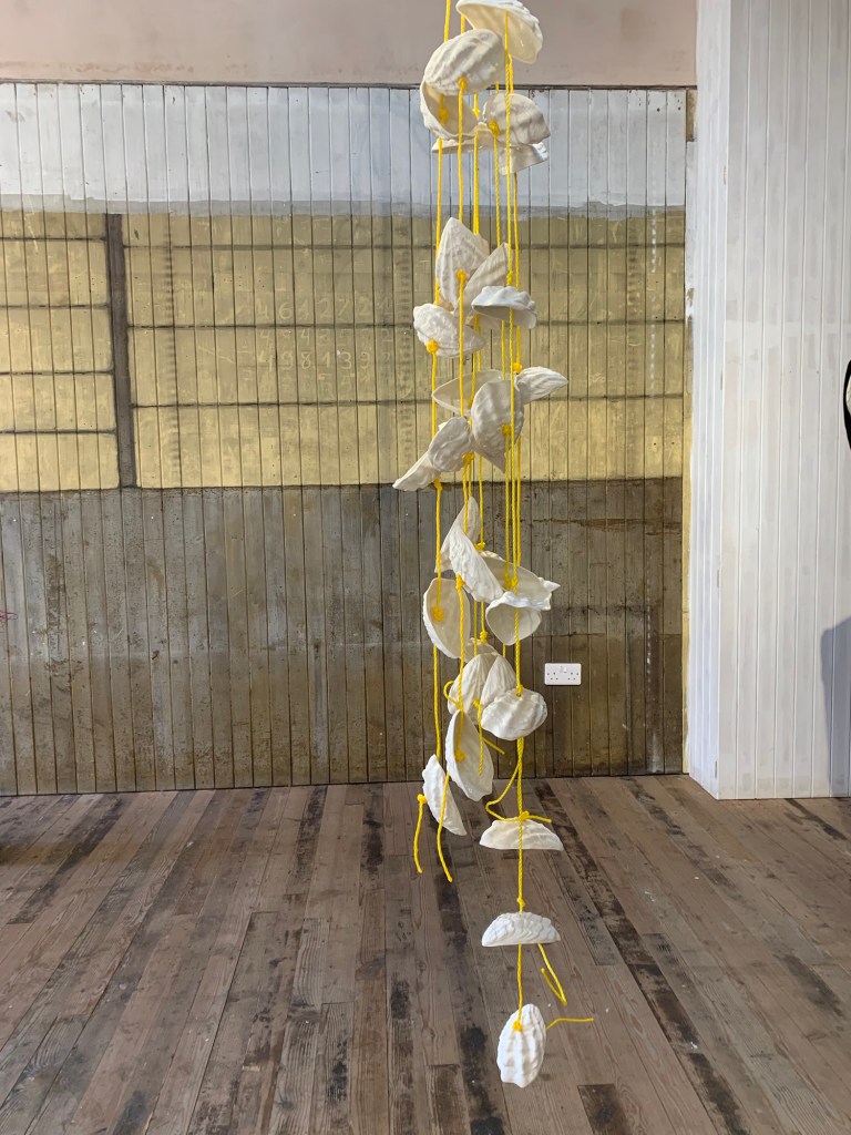 Following from this resistance, I am struck by the hanging ceramic oyster shells centred in the exhibition. ‘Hoya Ceramics’ by Anna Samson in collaboration with Rudy Kanhye and Lauren La Rose as a part of research ‘Shore Hut’. Exploring further into Fallow land and asking the questions, is a shore a fallow land? And what is a weed? In the exhibition space, porcelain oyster shells hang from bright yellow rope in the centre of the main room, as oysters attach onto the farming ropes on our coastal waters, the fragility of the porcelain a juxtaposition to the firm age rings that gives the oyster that unique and rugged shape.