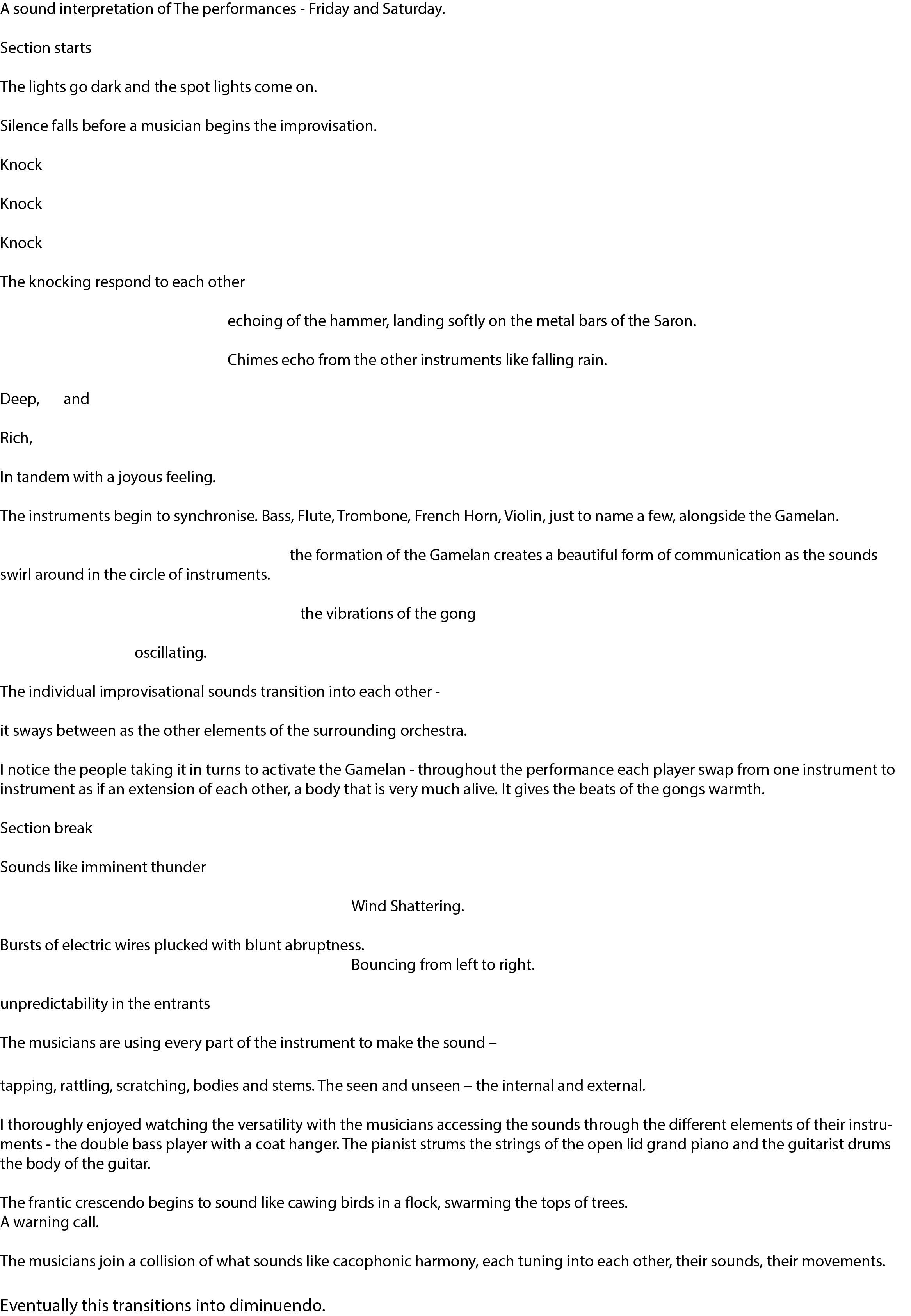 An interesting observation about improvisation that I noticed over the festival was: connecting with how music is played and interpreted. The need to see music outside the constraints of ‘traditional’ music playing allows music to be envisioned as an entirely embodied experience.